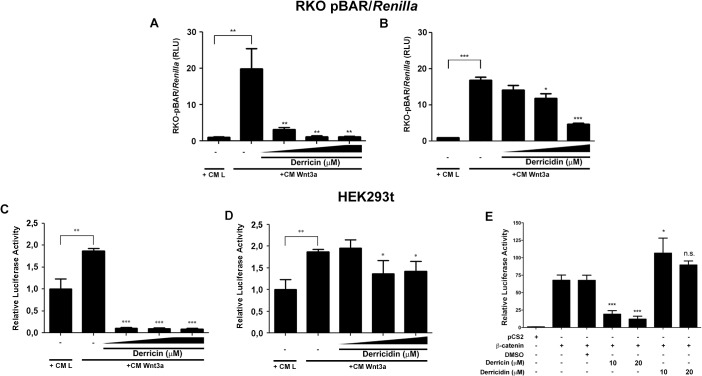 Fig 6. Derricin and derricidin inhibit Wnt-reporter activity in RKO-pBAR/Renilla and HEK293t.(A,C) Derricin inhibits Wnt-reporter activity starting at 10 μM in luciferase assays of RKO-pBAR/Renilla and of HEK293t. (B,D) Derricidin slightly inhibits Wnt-reporter activity at 20 μM in RKO-pBAR/Renilla and HEK293t. In RKO-pBAR/Renilla, higher inhibition is achieved at 50 μM of derricidin (B). (A,B) 10, 20, 50 μM of each chalcone. (C,D) 10, 20, 30 μM of each chalcone. (E) HEK293T activation of Wnt signaling through transfection of β-catenin is suppressed upon derricin treatment, but not derricidin. *p<0.05, **p<0.01, ***p<0.001. |
