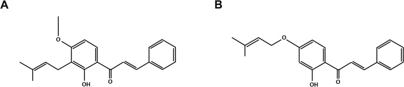 Fig 1. Chemical structures of the chalcones derricin (A) and derricidin (B). |