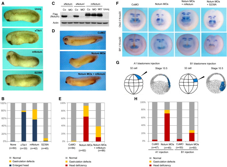Figure 5. Notum Is Required for Anterior Development in Xenopus Embryos (A and B) Dorsal injection of Notum mRNA, but not Notum(S239A), induced an enlarged head similar to that induced by Tiki1 mRNA, and resulting phenotypes were tabulated. (C) The Notum MO and the Notum’ MO inhibited protein synthesis from Xenopus Notum (xNotum) or Notum’ (xNotum’), but not mouse Notum (mNotum) mRNA. Co, MO, and MO’ indicate control MO and MOs against xNotum and xNotum’, respectively. (D and E) Dorso-animal injection of the two Notum MOs together caused anterior defects that were rescued by mNotum mRNA, and resulting phenotypes were tabulated. (F) The Notum MOs suppressed expression of forebrain markers Otx2 and Bf1 and a hindbrain marker Krox20 at stage 17. See also Table S1. (G) Illustration of the MO-injected A1 and B1 blastomeres at 32-cell stage and their descendent tissues at stage 10.5. (H) The Notum MOs injected into the A1 blastomeres caused anterior defects in more embryos (69%) than those injected into the B1 blastomeres (22%). See also Figures S4 and S5; Tables S2 and S3. |