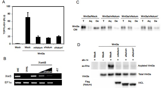 Figure S4. Characterization of Xenopus laevis Notum and Notumâ. Related to Figure 5. This figure provides additional data demonstrating that Xenopus laevis Notum and Notumâ behave like mouse Notum and inhibit Wnt signaling through Wnt deacylation. Appears before Figure 5. (A) Xenopus laevis Notum (xNotum) and Notumâ (xNotumâ), like mouse Notumm(mNotum), inhibited Wnt3a-induced TOPFLASH. Error bars represent SD of triplicated experiments. (B) xNotum inhibited Xnr3 induction by Wnt8 in animal pole explants. Two doses of xNotum mRNA (100 and 200pg) were used. (C) The Wnt3a protein modified by mouse Notum or xNotum or xNotumâ became hydrophilic in the Triton X-114 detergent-aqueous phase separation assay. (D) xNotum and xNotumâ, like mNotum, diminished Wnt3a acylation when each was coexpressed with Wnt3a in HEK293T cells |