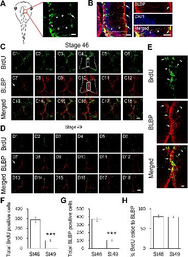 Fig 1. Developmental regulation of BLBP-positive radial glia and BrdU-positive proliferative cells in the Xenopus tectum.