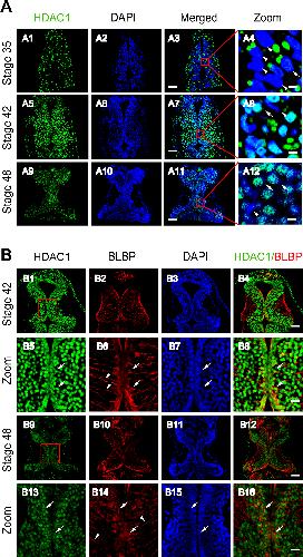 (A). Representative immunofluorescent images showing HDAC1 staining in cells of the developing tectum at stages 35 (A1–A4), 42 (A5–A8) and 48 (A9–A12), respectively. Scale: 50 μm. Zoomed in images are demarked by red lines and are shown to the right of each original figure (A4, A8, A12). Scale: 5 μm. Arrow heads indicate cell nuclei stained for DAPI alone, whereas arrows indicate nuclei that also contain HDAC1. (B). Representative immunofluorescent images showing colocalization of HDAC1 and BLBP staining at stages 42 (B1–B4, zoom in: B5–B8), and 48 (B9–B12, zoom in: B13–B16), respectively. Arrow heads indicate the processes of BLBP-stained RGs. Arrows indicate BLBP-staining RGs contain HDAC1. Scale: 50 μm (zoom in: 10 μm).