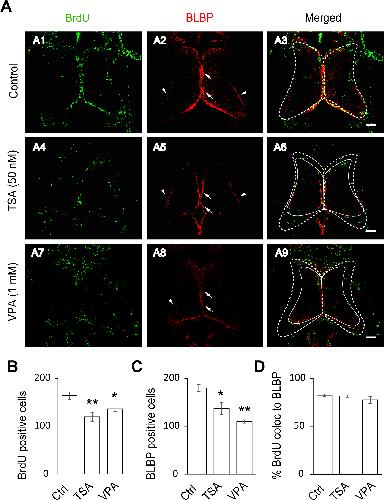 (A). Representative co-staining images showing the BrdU- and BLBP-positive cells in control (A1–A3), TSA-treated (50 nM, A4–A6) and VPA-treated (1 mM, A7–A9) tecta. The BLBP-positive cell bodies reside along the midline of the ventricular layer of the tectum (arrows) with endfeet on the edge of neuropil (arrow heads). The control tectum was outlined with a white dotted line (A3), which was put on TSA- (A6) or VPA-treated (A9) tectum. The TSA- (A6) or VPA-treated (A9) tectum was outlined with a solid line, which is smaller than control tectum (A3). Scale: 50 μm. (B-C) Quantification data showing that the number of BrdU- and BLBP-positive cells were significantly decreased in TSA- or VPA-treated tecta compared to the control. (BrdU: Ctrl, 163.2 ± 7.9, N = 5, TSA, 119.4 ± 9.3, N = 5, VPA, 136.0 ± 5.7, N = 3; BLBP: Ctrl, 179.2 ± 7.2, N = 5, TSA, 137.0 ± 12.2, N = 5, VPA, 109.7 ± 3.5, N = 3; *p<0.05, **p<0.01). (D). Most of BrdU-labeling cells are colocalized to BLBP-positive cells (Control: 82.3% ± 1.2%, N = 5, TSA: 81.4% ± 1.1%, N = 3, VPA: 77.3% ± 3.4%, N = 3).