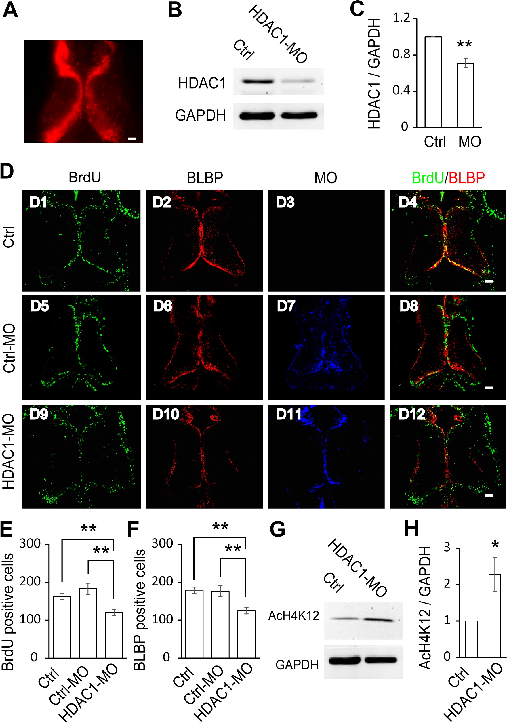 (A). Representative fluorescence image showing the optic tectum transfected with HDAC1-MO tagged with lissamine in vivo. (B). Western blot analysis of homogenates from control and HDAC1-MO transfected brains using an anti-HDAC1 antibody. (C). Quantification revealed that HDAC1 expression was significantly decreased in the HDAC1-MO transfected tectum compared to controls. Data is represented as an intensity ratio of HDAC1 to GAPDH normalized to the control value. Two-tailed T-test, N = 3, **p<0.01. (D). Representative immunofluorescence images of BrdU- and BLBP-labeled cells in control (D1-D4), Ctrl-MO (D5-D8), and HDAC1-MO (D9-D12) transfected brains in stage 48 tadpoles. Scale: 50 μm. (E-F). Summary data showing that HDAC1-MO transfection significantly decreased the number of BrdU- (E) and BLBP-labeled cells (F). There was no significant change in BrdU- or BLBP-labeled tectal cells electroporated with Ctrl-MO (E, F). (BrdU: Ctrl, 163.2 ± 7.9, N = 5, Ctrl-MO, 183.0 ± 14.6, N = 4, HDAC1-MO, 120.0 ± 8.5, N = 5; BLBP: Ctrl, 179.2 ± 7.2, N = 5, Ctrl-MO, 176.5 ± 11.5, N = 4, HDAC1-MO, 125.2 ± 8.4, N = 5; **p<0.01). (G). Acetylation levels of histone H4 at lysine 12 (AcH4K12) were measured by Western blot of total optic tectal extracts. Representative bands for control and HDAC1-MO transfected tadpoles. (H). Summary data showing that acetylation of H4K12 in HDAC1-MO animals is significantly increased compared to control tadpoles. N = 3, Two-tailed T-test, *p<0.05.