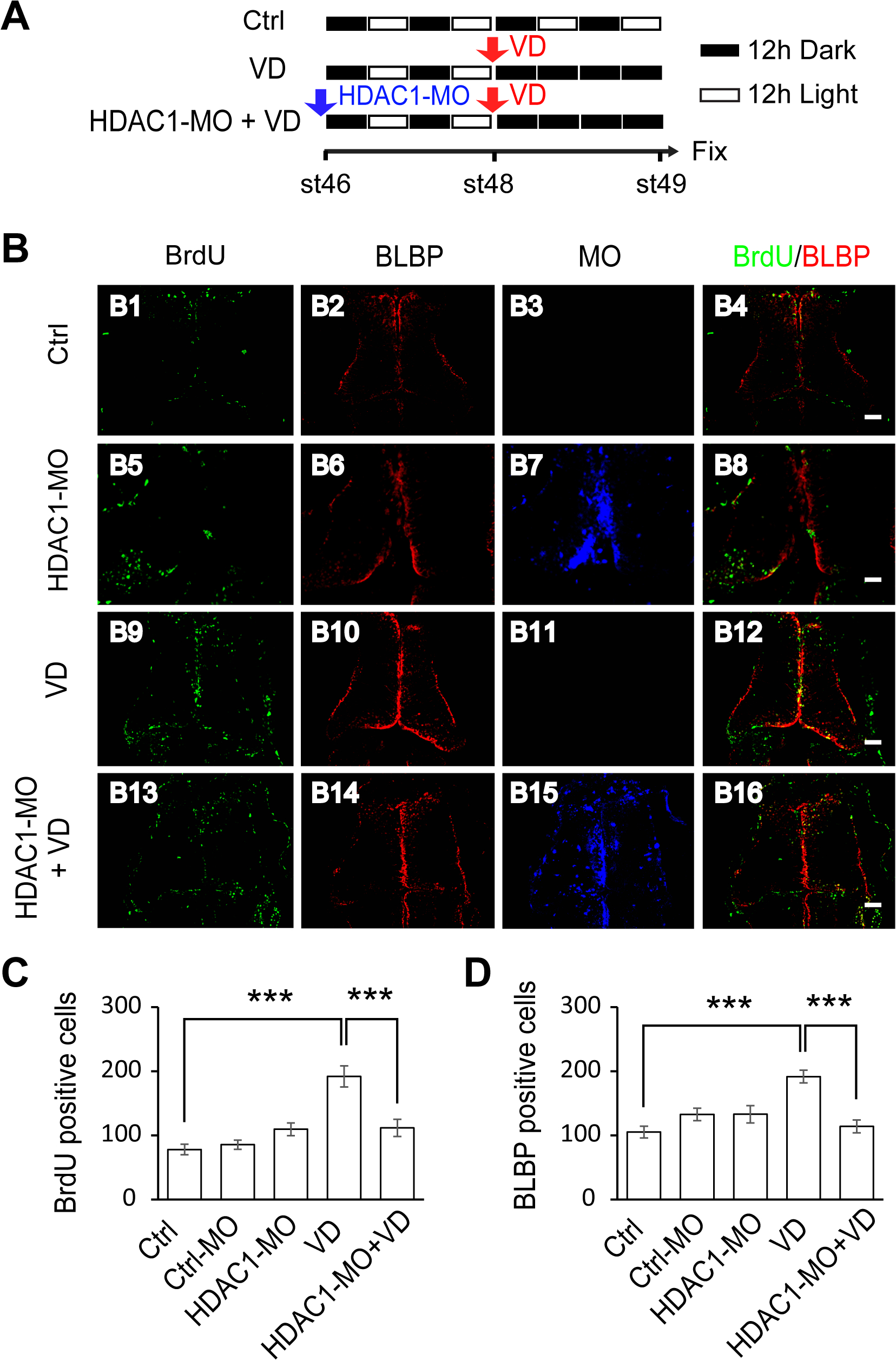 (A). A cartoon showing that stage 46 tadpoles were placed in a 12h/12h dark light incubator for control, or put into a dark box after 48 hours for VD, or electroporated with HDAC1-MO and placed in a dark box after 48 hours for HDAC1-MO+VD. Tadpoles were incubated with BrdU for immunostaining at stage 49. (B) Fluorescent images showing representative BrdU- and BLBP-labeled cells in control (B1-B4), HDAC1-MO (B5-B8), VD (B9-B12) and HDAC1-MO+VD (B13-B16) tadpoles. Scale: 50 μm. (C-D). Quantification data revealed that visual deprivation increases the number of BrdU- (C) and BLBP-labeled cells (D) and HDAC1-MO knockdown blocked VD-induced increase of proliferative cells. (BrdU: Ctrl, 78.0 ± 8.3, N = 5, Ctrl-MO, 85.4 ± 7.1, N = 5, HDAC1-MO, 109.5 ± 9.8, N = 6, VD, 191.8 ± 16.4, N = 4, HDAC1-MO+VD, 111.6 ± 13.5, N = 5; BLBP: Ctrl, 105.2 ± 9.2, N = 5, Ctrl-MO, 132.6 ± 9.7, N = 5, HDAC1-MO, 133.0 ± 13.5, N = 6, VD, 191.7 ± 9.9, N = 4, HDAC1-MO+VD, 114.0 ± 10.1, N = 5; ***p<0.001).