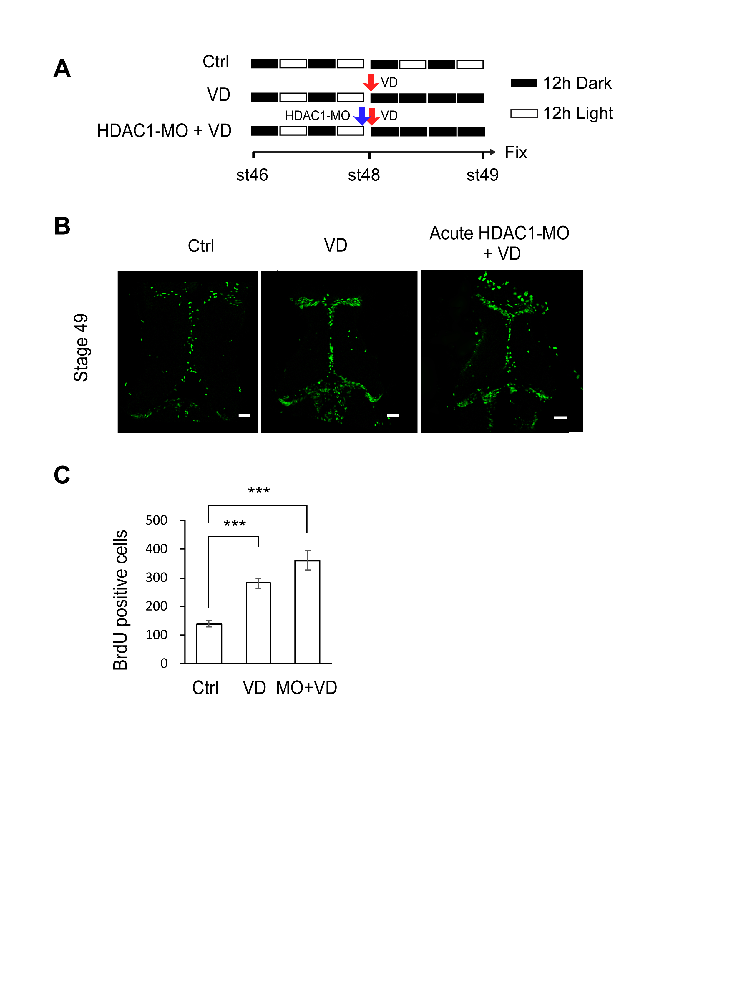 (A). A cartoon showing that stage 46 tadpoles were placed in a 12h/12h dark/light incubator for 96 hrs (Ctrl), or put into a dark box for 48 hrs after 2 days of dark/light cycle (VD), or electroporated with HDAC1-MO and immediately placed in a dark box for 48 hrs after 2 days of dark/light cycle (acute HDAC1-MO+VD). Tadpoles were incubated with BrdU for immunostaining at stage 49. (B) Fluorescent images showing representative BrdU-labeled cells in control (left panel), VD (middle panel) and acute HDAC1-MO+VD (right panel) tadpoles. Scale: 50 μm. (C). Quantification data showed that visual deprivation increases the number of BrdU-labeled cells but acute HDAC1-MO transfection and VD does not change the total number of proliferative cells compared to VD-exposed tadpoles. N = 4, 6, 5, for Ctrl, VD and HDAC1-MO+VD, respectively, ***p<0.001.