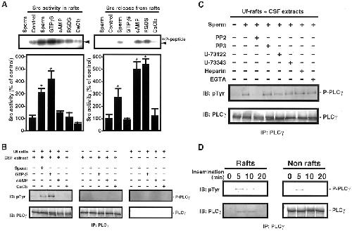 Activation and translocation of Src and phospholipase Cγ. A, left panels, rafts (0.5 μg of protein that corresponds to about 5â10 eggs, 10 μl) from unfertilized eggs were preincubated for 10 min with sperm (106/ml), GTPγS(1mM), cAMP (1 mM), RGDS (1 mM), or CaCl2 (1 mM), and then subjected to in vitro kinase assay with Cdc2 peptide as an exogenous substrate. Right panels, rafts preincubated as in the left panel were diluted and ultracentrifuged. The resulting supernatants were immunoprecipitated with anti-Src antibody, and the immunoprecipitated Src activity was assessed by in vitro kinase assay. Upper panels show representative images for phosphorylated Cdc2 peptide (32P-peptide, indicated by arrowheads). Bars in the lower graphs show mean ± S.D. of three independent experiments. Bars with an asterisk indicate that the data are significantly different from control (p < 0.01). In both experiments, sperm alone did not show any peptide phosphorylation activity. B, rafts from unfertilized eggs (Uf-rafts, 0.5 μg of protein) and/or CSF extracts (500 μg of protein that corresponds to about 4â8 eggs) were preincubated with activators as in panel A and then subjected to in vitro kinase assay. The reaction mixtures were treated with EDTA and SDS, diluted, and subjected to immunoprecipitation (IP) with anti-PLCγ. The immunoprecipitates were analyzed by immunoblotting (IB) with either anti-phosphotyrosine antibody (Tyr(P), PY99 IgG at 0.2 μg/ml), or anti-PLCγ antibody (1 μg/ml IgG). The positions of tyrosine-phosphorylated PLCγ (P-PLCγ) and total PLCγ are indicated. C, mixtures of unfertilized egg rafts (0.5 μg of protein) and CSF extracts (50 μg of protein) were preincubated with sperm (106/ml), and then subjected to in vitro kinase assay in the presence of various compounds: PP2 (10 μM), PP3 (10 μM), U73122 (10 μM), U73343 (10 μM), heparin (100 μM), and EGTA (5 mM). Tyrosine phosphorylation of PLCγ was analyzed as in panel B. D, rafts (50 μg of protein) and non-raft fractions (500 μg of protein) were prepared from Xenopus eggs at different time points after insemination. The extent of tyrosine phosphorylation and total amount of PLCγ in each fraction were assessed by immunoprecipitation and immunoblotting as in panel B. |
