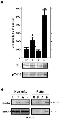 Up-regulation of raft-associated Src and tyrosine phosphorylation of PLCγ in activated Xenopus eggs. A, rafts (0.5 μg of protein) from unfertilized (Uf), fertilized (F, 107/ml sperm, 5 min), A23187-activated (A, 0.5 μM, 5 min), or H2O2-activated eggs (H, 10 mM, 5 min) were subjected to in vitro kinase assay. 32P incorporation into Cdc2 peptide was quantified by a BAS2000 Bioimaging analyzer. The data represent mean ± S.D. of four independent experiments. *, p < 0.01. The raft preparations were also directly analyzed by immunoblotting with either anti-Src antibody (Src) or anti-Tyr(P) 416 antibody (pY416). B, rafts (5 μg of protein) and non-rafts (500 μg of protein) prepared from egg samples were analyzed for tyrosine phosphorylation of PLCγ as in Fig. 1D. |