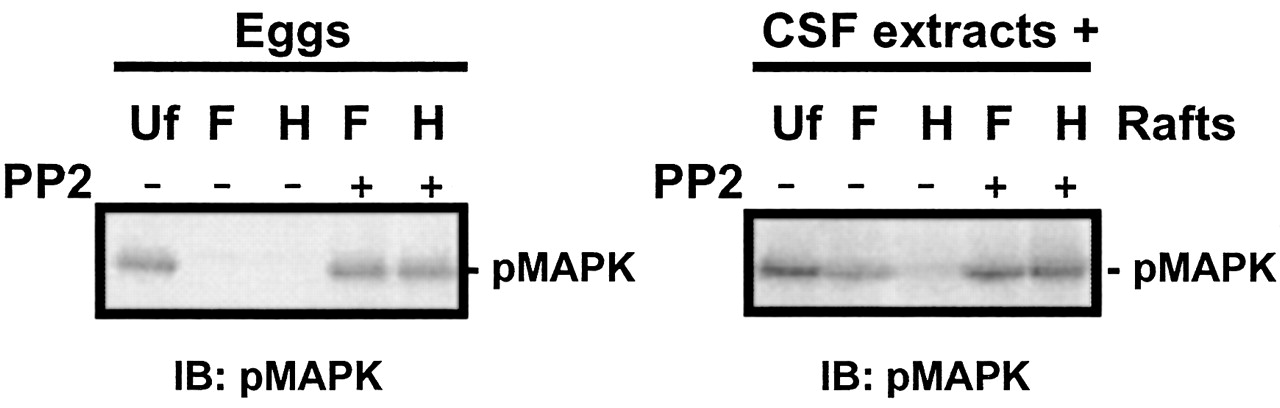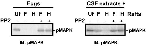 Dephosphorylation of p42 MAP kinase in eggs and CSF extracts. Left panel, dephosphorylation of p42 MAP kinase was determined by immunoblotting (1 μg/ml anti-pMAPK antibody) of Triton X-100-soluble fractions (10 μg of protein) from different egg samples: unfertilized (Uf), fertilized (F), and H2O2-treated eggs (H) that had been premicroinjected with none or PP2 (10 μM). Right panel, dephosphorylation of p42 MAP kinase was determined by immunoblotting of CSF extracts that had been treated with rafts from different egg samples (Uf, F, and H) in the absence or presence of 10 μM PP2 for 40 min. Data shown are representative results of three independent experiments. |