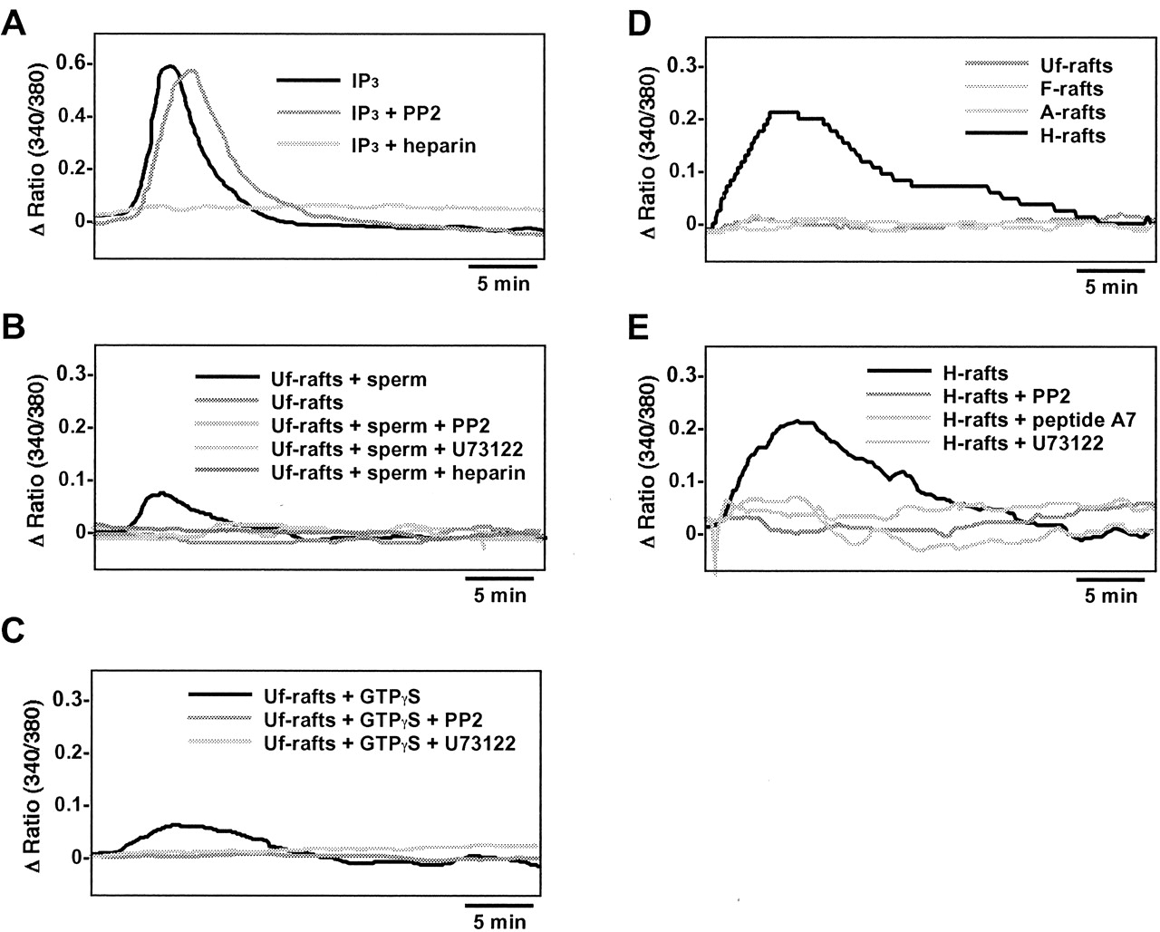 Raft-dependent Ca2+ release in the egg extracts. A,Ca2+ release in CSF extracts was triggered by application of InsPtd(1,4,5)P3 (10 μM) in the absence or presence of PP2 (5 μM) or heparin (100 μM), and monitored by ratio recording of Fura 2 fluorescent signal. B, rafts from unfertilized eggs (Uf-rafts) were preincubated with or without sperm (106/ml) and various inhibitors: PP2 (10 μM), U73122 (10 μM), or heparin (100 μM), and then added to CSF extracts to monitor Ca2+ release as in panel A. C,Ca2+ release was assessed by using GTPγS(1mM) as a raft activator in the absence or presence of PP2 (10 μM) or U73122 (10 μM). D, rafts from various egg samples (Uf-, F-, A-, and H-rafts) were analyzed for their ability to induce Ca2+ release in CSF extracts. E, H-rafts were subjected to Ca2+ release assay in the absence or presence of PP2 (10 μM), peptide A7 (15 μM), or U73122 (10 μM). Shown are representative traces of the fluorescent ratio signal of Fura 2 as a function of time. |