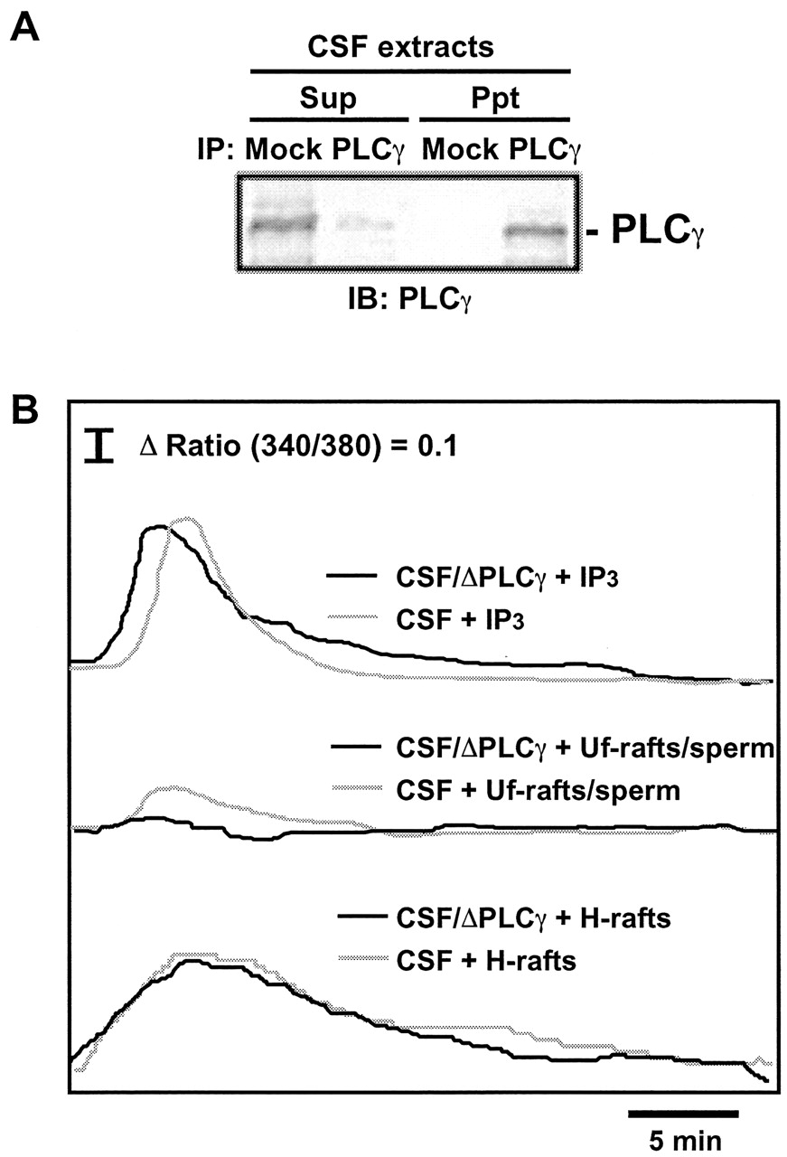 Requirement of PLCγ for raft-dependent Ca2+ release. A, CSF extracts (500 μg of protein) were depleted of endogenous PLCγ by immunoprecipitation (IP) with anti-PLCγ antibody (1 μg of IgG); or mock depleted by immunoprecipitation with control mouse IgG (1 μg of protein) (Mock), as described under âExperimental Procedures.â Proteins in the depleted extracts (Sup) and the immune complexes (Ppt) were separated by SDS-PAGE and analyzed by immunoblotting with anti-PLCγ antibody. B, CSF extracts depleted of PLCγ (CSF/δPLCγ) were subjected to Ca2+ release assay in the absence or presence of InsPtd(1,4,5)P3 (10 μM), Uf-rafts plus either sperm or H-rafts. Control data with the use of intact CSF extracts (gray lines) were also shown. |