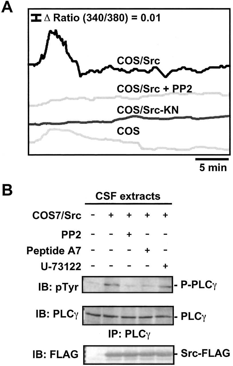 Src-dependent Ca2+ release by rafts prepared from COS7 cells. A, rafts prepared from COS7 cells expressing either FLAG-tagged wild type (COS/Src) or kinase-negative (COS/Src-KN) Xenopus Src or vector alone (COS) were subjected to Ca2+ release assay in CSF extracts. Shown are representative traces of the Fura 2 fluorescent ratio signal as a function of time. Effect of PP2 (10 μM) on wild type Src was also examined (COS/Src + PP2). B, mixtures of CSF extracts and COS7 cell rafts were subjected to in vitro kinase assay in the absence or presence of inhibitors as indicated (each at 10 μM). The reaction mixtures were immunoprecipitated with anti-PLCγ antibody and the immunoprecipitates were analyzed for tyrosine phosphorylation of PLCγ. Expression of FLAG-tagged Xenopus Src (Src-FLAG) was also analyzed by immunoblotting the kinase reaction mixtures with anti-FLAG antibody (1 μg/ml IgG). |