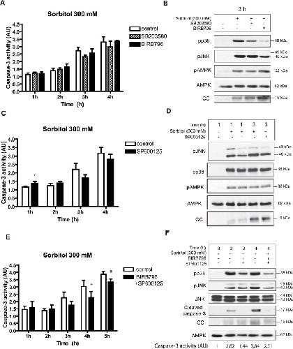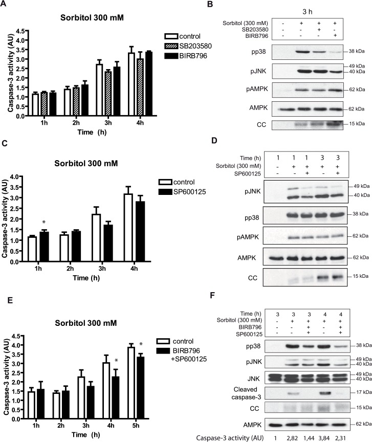 Fig 4. Inhibition of the p38 and JNK signaling pathways by chemical compounds reduces osmostress-induced apoptosis.A and B. p38 inhibitors do not modify osmostress-induced apoptosis. Oocytes were pre-incubated in MBS with SB203580 (100 μM) or BIRB796 (100 μM) for 1 h and then treated with 300 mM sorbitol in the presence of inhibitors. Caspase-3 activity was determined at different times giving value 1 to non treated oocytes. Data are represented as mean ± SEM, (n = 4). pp38, pJNK, pAMPK, AMPK and cytochrome c (CC) release were determined by Western blot at 3 h after treatment. C and D. The JNK inhibitor SP600125 (100 μM) does not reduce osmostress-induced apoptosis. Oocytes were pre-incubated with the inhibitor, treated as described previously, and caspase-3 activity was determined at different times. Data are represented as mean ± SEM (n = 6) and analyzed with Paired t-test comparing control versus inhibitor treatment. * p<0.05. The Western blot shows results at 1 and 3 h after treatment. E and F. BIRB796 + SP600125 treatment reduces osmostress-induced apoptosis. Oocytes were incubated with 100 μM BIRB796 plus 100 μM SP600125, treated as described before, and caspase-3 activity analyzed. Data are represented as mean ± SEM, (n = 3). * p<0.05 (Paired t-test). pp38, pJNK, JNK, cleaved caspase-3, and cytochrome c (CC) release were determined by Western blot at 3 and 4 h after treatment. The Western blots in all figures are representative of at least three independent experiments. |