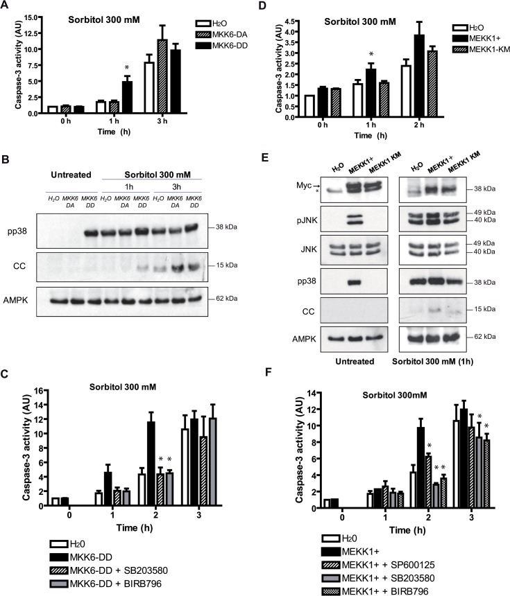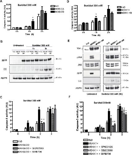 Fig 5. Constitutively active MKK6 or MEKK1 accelerate hyperosmotic shock-induced apoptosis.A and B. MKK6-DD accelerates osmostress-induced apoptosis. Oocytes injected with 50 nl (5ng) of the cRNAs MKK6-DD (constitutively active), MKK6-DA (catalytically inactive), or H2O (control) were treated with 300 mM sorbitol for 1 h and 3 h. Caspase-3 activity was determined giving value 1 to water-injected oocytes. Data are represented as mean ± SEM, (n = 4), *p<0.05 comparing with water-injected oocytes (One-way ANOVA and Dunnett Multiple Comparison Test). pp38, cytochrome c (CC), and AMPK (loading control) were analyzed by Western blot. C. MKK6-DD effect on apoptosis is p38-dependent. Oocytes injected with MKK6-DD or H2O were pre-incubated in MBS for 18 h in the presence or absence of inhibitors (100 μM) and then incubated with 300 mM sorbitol in the presence or absence of inhibitors. Caspase-3 activity was analyzed as reported previously. Data are represented as mean ± SEM, (n = 3). *p<0.05 comparing with MKK6-DD injected oocytes. D and E. MEKK1+ accelerates osmostress-induced apoptosis. Oocytes were injected with 50 nl (5ng) of the cRNAs MEKK1+ (constitutively active), MEKK1-KM (catalytically inactive), or H2O (control) and treated with 300 mM sorbitol. Caspase-3 activity was measured as reported. Data are represented as mean ± SEM, (n = 3), *p<0.05 comparing with water-injected oocytes. pJNK, JNK, pp38, cytochrome c (CC), and AMPK (loading control) were analyzed by Western blot. Expression of the MEKK1+ and MEKK1-KM, containing a myc tag, was confirmed (see arrow). The asterisck (*) indicates an unspecific band detected with the antibody. F. MEKK1+ effect on apoptosis is JNK and p38-dependent. Oocytes treated as in C but with MEKK1+ and the corresponding inhibitors. Data are represented as mean ± SEM, (n = 3), *p<0.05 comparing with MEKK1+ injected oocytes. Western blots in Fig B and E are representative of at least three independent experiments. |