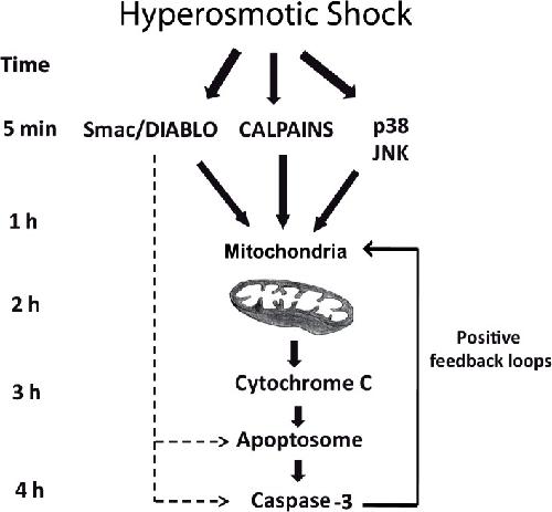 Fig 6. Osmostress-induced apoptosis in Xenopus oocytes.Four independent pathways are activated by hyperosmotic shock: JNK, p38, calpains, and Smac/DIABLO. Sustained activation of stress protein kinases in combination with Smac/DIABLO and calpains converge on the mitochondria to induce the release of high levels of cytochrome c into the cytosol, which in turn activates caspase-3 engaging several positive feedback loops to make the cell death program irreversible. |