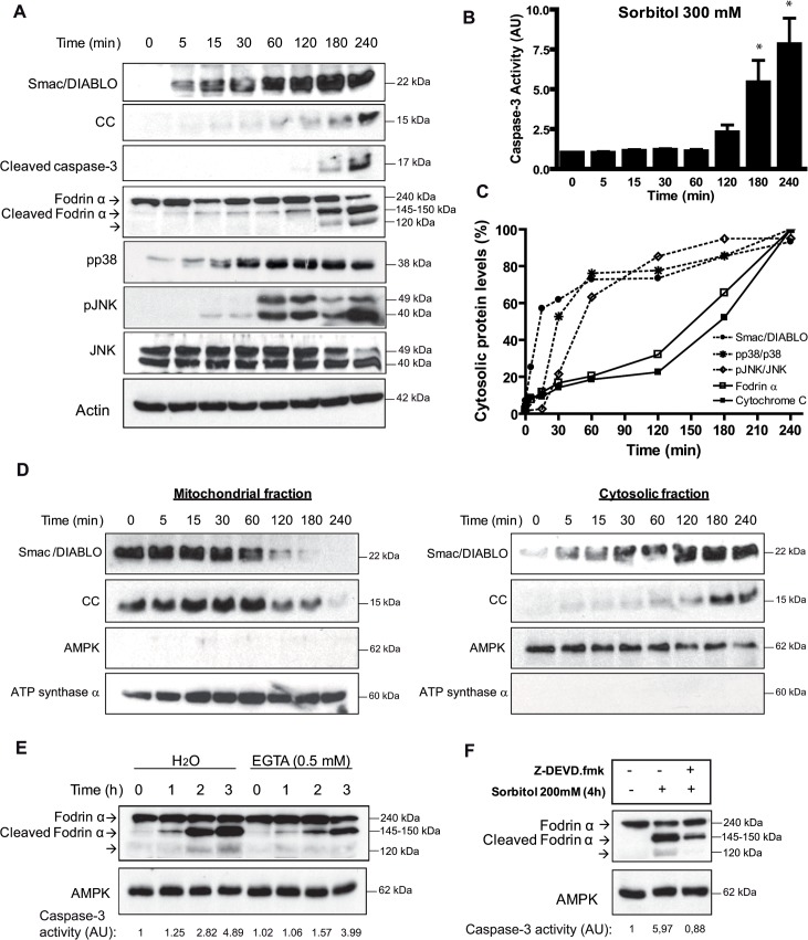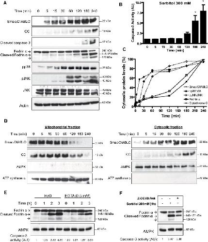 Fig 1. Hyperosmotic shock induces rapid release of Smac/DIABLO, calpain activation, p38 and JNK phosphorylation.A. Osmostress induces rapid release of Smac/DIABLO, calpain activation, p38 and JNK phosphorylation. Smac/DIABLO, cytochrome c (CC), cleaved caspase-3, fodrin α (240 kDa), cleaved fodrin α (145â150 kDa), pp38, pJNK, JNK, and actin (loading control) were determined by Western blot at different times in oocytes treated with 300 mM sorbitol. B. Time-course of caspase-3 activation induced by hyperosmotic shock. Oocytes were treated with 300 mM sorbitol and caspase-3 activity was determined giving value 1 to non treated oocytes. Data are represented as mean ± SEM, (n = 6), *p<0.05 (t-test) comparing with non treated oocytes. C. Kinetics of Smac/DIABLO and cytochrome c release, p38 and JNK phosphorylation, and fodrin α proteolysis induced by hyperosmotic shock. Oocytes were exposed to 300 mM sorbitol for 4 h and samples were collected at different times to analyze Smac/DIABLO and cytochrome c release, p38 and JNK phosphorylation, and fodrin α proteolysis (as a marker of calpain activation) by Western blot. Quantitative analysis was performed in the blots from three independent experiments and the average values represented as the percentage of protein levels for Smac/DIABLO, cytochrome c and fodrin α (145â150 kDa band), or as the ratio of pp38/p38 and pJNK/JNK, giving 100% to the highest value obtained in the time-course experiment. D. Hyperosmotic shock induces Smac/DIABLO release from the mitochondria. Oocytes were treated with 300 mM sorbitol, and cytosolic and mitochondrial fractions were obtained at different times as described in Materials and Methods. Smac/DIABLO and cytochrome c (CC) were analyzed by Western blot. AMPK and ATP synthase α were analyzed as markers of cytosolic and mitochondrial fractions, respectively. E. EGTA inhibitis calpain activation induced by osmostress. Oocytes were injected with EGTA (0.5 mM final concentration) or H2O (control) and 1 h later treated with 300 mM sorbitol and samples were collected at different times. Fodrin α (240 kDa), cleaved fodrin α (145â150 kDa), and AMPK (loading control) were determined by Western blot. Caspase-3 activity was determined as reported. F. Caspase-3 proteolyzes fodrin α. Oocytes were treated with 200 mM sorbitol for 4 h in the presence or absence of the caspase-3 inhibitor Z-DEVD.fmk (50 μM). Fodrin α (240 kDa), cleaved fodrin α (145â150 kDa), and AMPK (loading control) were determined by Western blot. Caspase-3 activity was determined as reported. Western blots in all figures are representative of at least three independent experiments. |