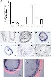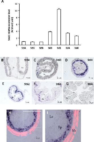 Snai2 expression is restricted to the connective tissue and peaks at the climax of intestinal metamorphosis. A: Snai2 mRNA level peaks at the climax (Stage 62). Quantitative RT-PCR analysis of Snai2 mRNA level in intestine from tadpoles at indicated stages, normalized against the control gene EF1a. B-G: In situ hybridization reveals connective tissue-specific expression of Snai2 in intestine. Note that high levels of Snai2 mRNA were detected fairly uniformly in the connective tissue at the climax (St61-62). H-I: Snai2 is not expressed in the muscle layers. In situ hybridization sections of Snai2 at the stage 61 were double-stained with smooth muscle actin antibody (red) to label the muscle layers (Ms). Ty: typhlosole, the single epithelial fold in in premetamorphic tadpoleintestine where connective tissue is abundant; Lu: lumen; Ep: epithelium. Note that Snai2 labeled cells are localized between epithelium and muscle layers.