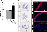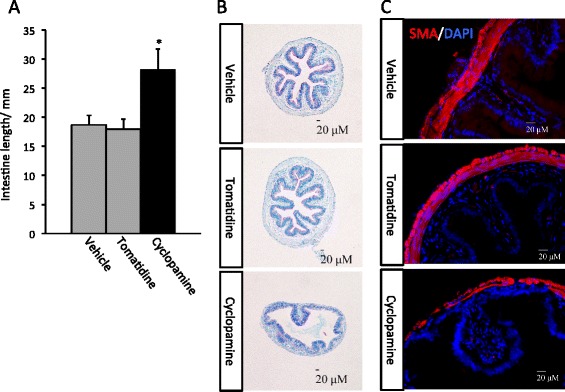 A: Cyclopamine-treated animals have longer intestine at the end of metamorphosis. Tadpoles at stage 58 were treated with vehicle (100% ethanol, final concentration in rearing water: 0.1%) (3 tadpoles) or tomatidine (7 tadpoles), or cyclopamine (8 tadpoles) till they reached stage 66. Intestinal length was measured from bile duct junction to colon for all animals. * indicated significant difference between the cyclopamine group and the other two groups (p < 0.05). Note that the cyclopamine-treated tadpoles completed metamorphosis, as judged based on external morphology, e.g., resorption of the tail, similarly as the animals in the tomatidine and vehicle groups. However, they had significant longer intestine. B: Retarded intestinal maturation in the cyclopamine-treated animals. Transverse sections of the intestine from the animals above were stained with methyl green pyronin Y (MGPY), which stained DNA in blue (methyl green) and RNA in red (pyronin Y). Note that the cyclopamine-treated animals had intestines with fewer and less structured epithelial folds as well as reduced connective tissue and muscles (outer layers). C: Immunofluorescence staining showing reduced intestinal muscle development in the cyclopamine-treated animals. The intestinal sections above were stained with anti-smooth muscle actin (SMA) antibody as well as DAPI for cell nuclei.