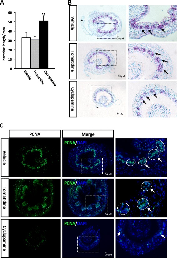 Inhibition of hedgehog signaling suppresses intestine shortening and remodeling at metamorphic climax. A: Cyclopamine-treated tadpoles have longer intestine at the climax. Tadpoles at stage 58 were treated with vehicle (100% ethanol, final concentration in rearing water: 0.1%) (9 tadpoles) or tomatidine (10 tadpoles), or cyclopamine (11 tadpoles) till they reached climax (stage 62). Intestine was isolated and measured from bile duct junction to colon. The animals in all three groups reached developed to stage 62 similarly as judged based on external morphology. ** indicate significant difference between the cyclopamine group and the two control groups (p < 0.001). B: Cyclopamine-treated tadpoles have fewer islets of adult epithelial stem cells. Transverse sections of the intestine from above were stained with methyl green pyronin Y (MGPY). The boxed area in the left panel is enlarged in the right panel. Note that at the climax of metamorphosis, the clusters (islets) of adult epithelial stem cells are stained strongly by MGPY (arrows) while the dying larval epithelial cells are only weakly stained [15,49,50]. The cyclopamine-treated tadpoles had smaller intestinal cross-section and fewer islets of adult cells. C: Cyclopamine-treated tadpoles have reduced cell proliferation. The intestinal sections above were stained with DAPI for nuclear DNA and anti-PCNA antibody for mitotic cells. The boxed area in the middle panel is enlarged in the right panel. Cyclopamine treatment significantly reduced cell proliferation in the intestine, especially in the epithelium. Note that the labeling in the epithelium was limited to the islet of the adult cells (arrows) but not in the dying larval epithelial cells, as expected.