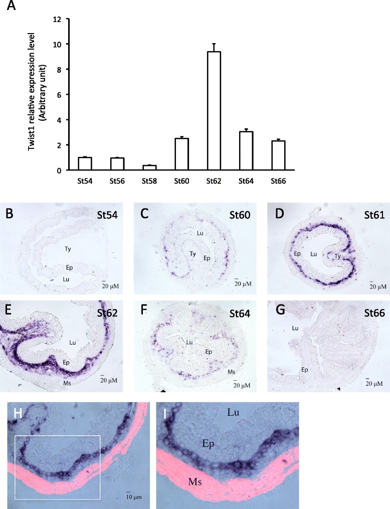 Twist1 has similar spatiotemporal expression profiles as Snai2 in the intestine. A: Twist1 mRNA level peaks at the climax (Stage 62). Quantitative RT-PCR analysis of Twist1 mRNA level in intestine from tadpoles at indicated stages, normalized against the control gene EF1a. B-G: In situ hybridization reveals connective tissue-specific expression of Twist1 in intestine. Note that Twist1 mRNA level peaked in the connective tissue at the climax (St61-62). H-I: Twist1 is not expressed in the muscle layers. In situ hybridization sections of Twist1 at the stage 61 were double-stained with smooth muscle actin antibody (red) to labeled the muscle layers (Ms). Ty: typhlosole, the single epithelial fold in in premetamorphic tadpoleintestine where connective tissue is abundant; Lu: lumen; Ep: epithelium. Note that Twist1 labeled cells are localized between epithelium and muscle layers.