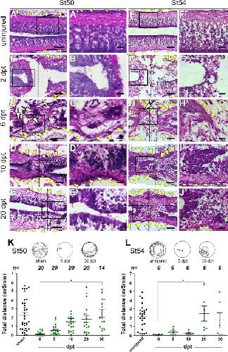 Fig. 2. Characterization of non-regenerative stages of Xenopus laevis. Hematoxylin and eosin staining of longitudinal sections of spinal cords from uninjured animals and at 2, 6, 10 and 20 dpt in pro-metamorphic stage 56 (AâE) and post-metamorphic stage 66 (FâJ) respectively. Black boxes indicate magnifications for stage 56 (Aâ²âEâ²) and 66 (Fâ²âJâ²). Samples of swim trajectories (top, single representative animals for each step) and graphs of the total time animals spent swimming in 5 min at stage 56 (K) and stage 66 (L) in sham-operated animals and in animals with spinal cord transection at 0, 5, 10, 20 and 30 dpt. Dotted line: injury site or ablation gap, yellow arrowheads: meningeal layer, arrow: cell clusters, vz: ventricular zone, svz: sub-ventricular zone. Scale bar (AâE) 100 µm; (FâJ) 200 µm; (Aâ²âJâ²) 30 µm. (For interpretation of the references to color in this figure legend, the reader is referred to the web version of this article.) |