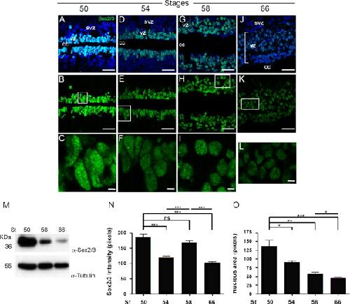 Fig. 3. Analysis of Sox2/3 expression in the spinal cord in non-regenerative and regenerative stages. (A–L) Longitudinal cryosections through the spinal cord of animals at stage 50 (A–C), 54 (D–F), 58 (G–I) and 66 (J–L), analyzed by immunostaining for Sox2/3 (green) and staining for TOTO3 (nuclei, blue). A, D, G and J. Double labeling for Sox2/3 and TOTO3. B,E,H and K. Sox2/3 only. (C, F, I and L) Higher magnification images of regions shown in white boxes in B, E, H, K. (M) Western blot showing immunolabeling for Sox2/3 in tadpoles (stage 50–58) and froglets (stage 66). α-tubulin immunolabeling is shown as a loading control. (N) Analysis of the signal intensity of Sox2/3 immunolabeling in of B,E,H and K. (O) Analysis of the area of the nuclei of C,F,I and L. cc: central channel, vz: ventricular zone and svz: sub-ventricular zone. Scale bars (A, B, D, E, G, H, J and K) 20 µm; (C, F, I and L) 2 µm. *P <0.05, **P<0.01, and ***P<0.001. (For interpretation of the references to color in this figure legend, the reader is referred to the web version of this article.) |