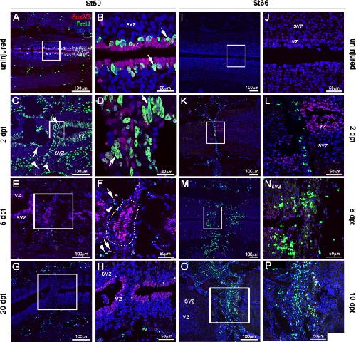 Fig. 4. Proliferation of Sox2/3+ cells in response to spinal cord injury. (AâP) Immunolabeling for BrdU and Sox2/3 in stage 50 or 66 animals at designated times after spinal cord transection show dramatic increases in proliferation in regenerative stages but not non-regenerative stages. Spinal cords were transected and animals were treated for 16 h with BrdU and fixed at 2, 6 or 10 dpt. Horizontal sections through the spinal cord were analyzed by double immunofluorescence BrdU (green) and Sox2/3 (red) from uninjured animals and at 2, 6 and 20 dpt in tadpoles stage 50 (AâH) and uninjured, 2, 6 and 10 dpt in froglets stage 66 (IâP). (B, D, F, H, J, L, N and P) Higher magnifications of regions shown in black boxes for A, C, E, G, I, K, M and O. Arrow and arrowheads in C, D and F: BrdU+Sox2/3+ cells and BrdU+ Sox2/3- respectively. vz: ventricular zone and svz: sub-ventricular zone. Nuclei: TOTO3 (blue). Scale bars are as indicated. (For interpretation of the references to color in this figure legend, the reader is referred to the web version of this article.) |