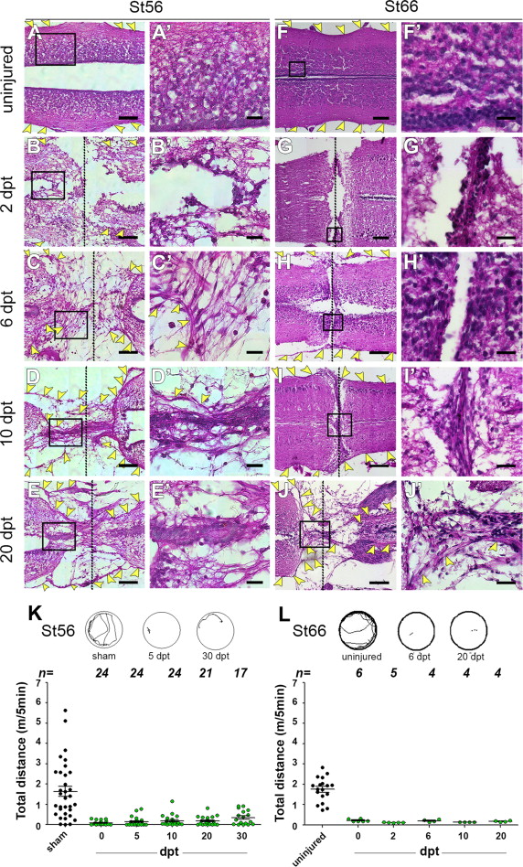 Fig. 2. Characterization of non-regenerative stages of Xenopus laevis. Hematoxylin and eosin staining of longitudinal sections of spinal cords from uninjured animals and at 2, 6, 10 and 20 dpt in pro-metamorphic stage 56 (AâE) and post-metamorphic stage 66 (FâJ) respectively. Black boxes indicate magnifications for stage 56 (Aâ²âEâ²) and 66 (Fâ²âJâ²). Samples of swim trajectories (top, single representative animals for each step) and graphs of the total time animals spent swimming in 5 min at stage 56 (K) and stage 66 (L) in sham-operated animals and in animals with spinal cord transection at 0, 5, 10, 20 and 30 dpt. Dotted line: injury site or ablation gap, yellow arrowheads: meningeal layer, arrow: cell clusters, vz: ventricular zone, svz: sub-ventricular zone. Scale bar (AâE) 100 µm; (FâJ) 200 µm; (Aâ²âJâ²) 30 µm. (For interpretation of the references to color in this figure legend, the reader is referred to the web version of this article.) |