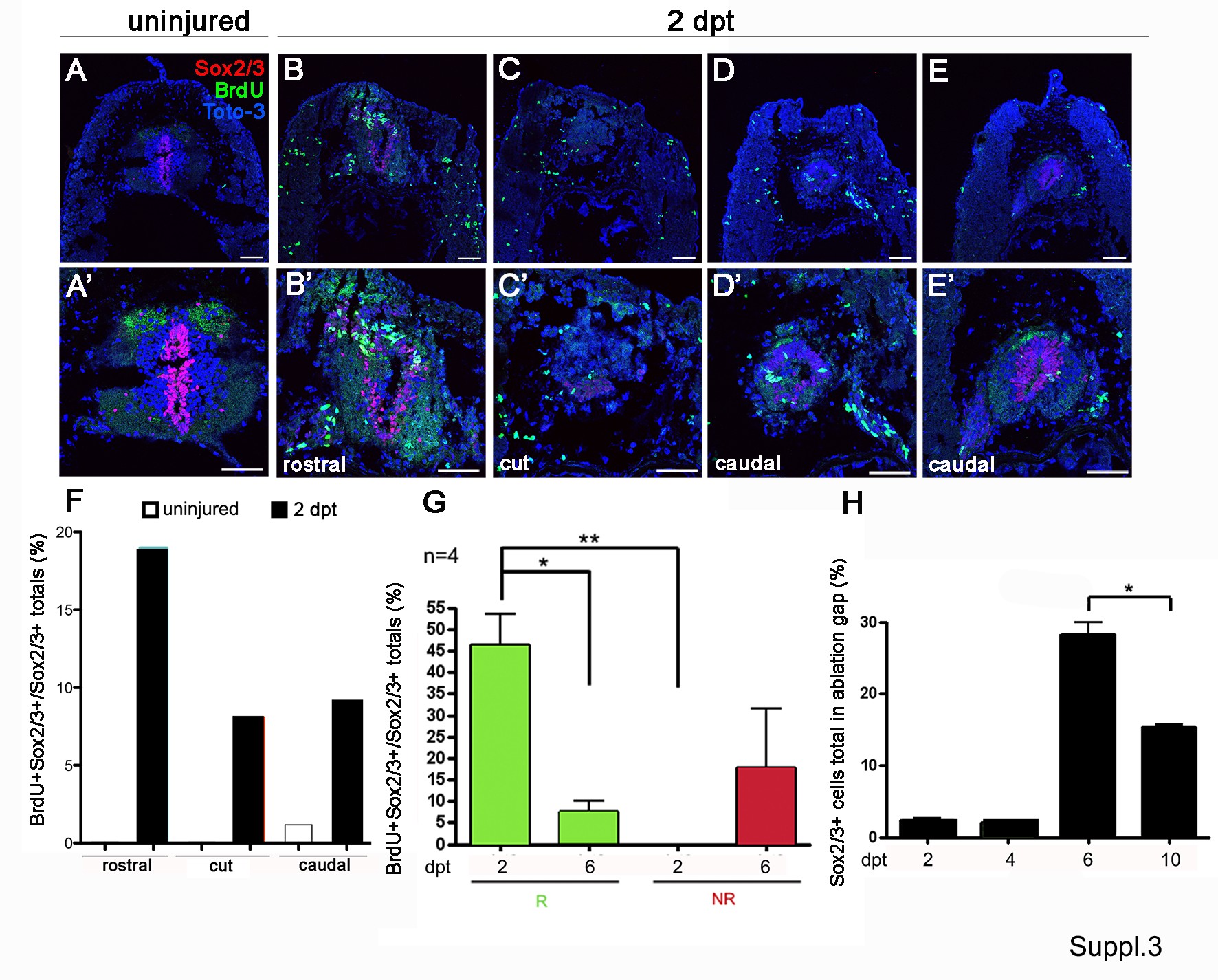 Fig. S3: Proliferation of Sox2/3+cells in response to spinal cord injury in transverse sections. Animals at stage 50 were analyzed by double immunofluorescence BrdU (green) and Sox2/3 (red) from spinal cord in transverse sections in uninjured animals (uninjured, A, A′) and at 2 dpt (B–E′). Magnifications of (A–E) are show in (A′ –E′). (F) Quantification of Sox2/3+/BrdU+ cells present in different areas of the injured spinal cord shown in (A′–E′). (G) Quantification of Sox2/3+/BrdU+ cells present in the ablation gap shown in (Fig. 4). (H) Quantification of Sox2/3+ cells present in the ablation gap shown in (Fig. 4). Scale bar in (A–E) 100 µm (A′–E′) 50 µm. ⁎P<0.05, ⁎⁎P<0.01, and ⁎⁎⁎P<0.001. |