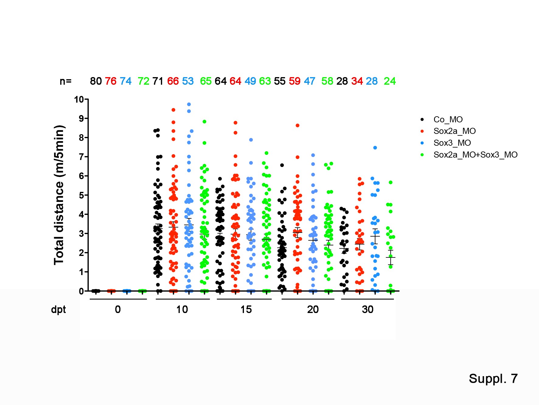 Fig. S7: Effect of Sox3_MO in spinal cord regeneration. Graph of the total distance swam by tadpoles electroporated with Co_MO (black circles), Sox2a_MO (red circles), Sox3_MO (blue circles) and Sox2a_MO+Sox3_MO (green circles). m/5 min: meters in 5 min. |