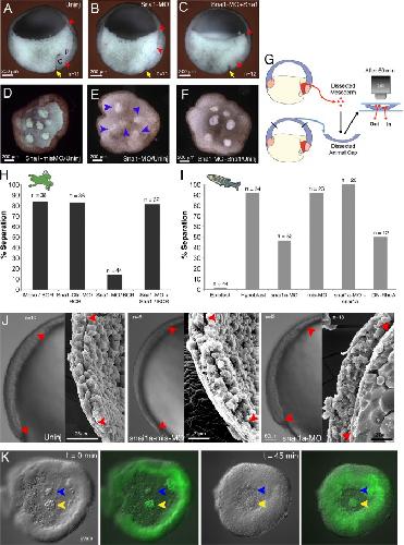 Figure 1. Snail1 function in tissue separation. (A–C) Brachet’s cleft in sagittally fractured stage 10.5 Xenopus gastrulae. Uninjected embryos (A); cleft (between red arrowheads) is shortened by Xsnail1-MO (B), but not Xsnail1-MO/Xsnail1 mRNA coinjection (C). Yellow arrows indicate the blastopore. C, chordamesoderm; P, prechordal mesoderm; L, leading edge mesendoderm; n, number of embryos. (D–F) BCR assay for separation behavior in Xenopus. Prechordal mesoderm explants injected with control Sna1-misMO (D), Xsnail1-MO (E), or Xsnail1-MO and Xsnail1 mRNA (F) are placed on explanted BCR. Explants sunken after 1 h in E are indicated by arrowheads. (G) Outline of BCR assay. (H) Quantitation of BCR assay. Y axis, percentage of test explants remaining on surface; n, number of explants. (I–K) Tissue separation in zebrafish. (I) Quantitation of separation behavior as in H. (J) Brachet’s cleft in live embryos (left panels) and SEM micrographs (right panels) at 75% epiboly in wild-type and snai1a-misMO– and snail1a MO–injected embryos. Red arrowheads indicate Brachet’s cleft; n, number of embryos. (K) In vitro assay, differential interference contrast images, and fluorescence overlay images at explanation (left) and 45 min later (right). Epiblast test explant (blue arrowheads) sinks into the epiblast, and fluorescent hypoblast explant (yellow arrowheads) remains on the surface. |