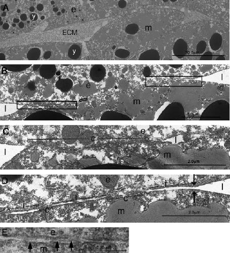 Figure 8. Ultrastructure of Brachet’s cleft. (A) Low-magnification view of Brachet’s cleft. ECM stained with LN. Note size differences of yolk platelets (y) in mesoderm versus ectoderm. (B–E) Contacts between ectoderm and mesoderm cell in absence of ECM staining. Boxes in B indicate regions shown at higher magnification in D–E. e, ectodermal BCR; m, prechordal mesoderm; l, large gaps; i, intermediate, gap-like contacts; c, close, adherens junction–like contacts. Arrows in D indicate point of divergence of membranes at end of intermediate contact and in E indicate characteristics of adherens junctions at high cadherin density. |