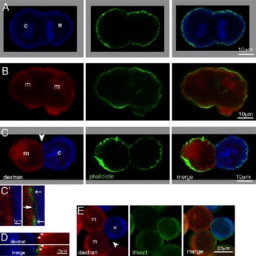 Figure 10. Actin cortex at cleft contacts. (A–C) Ectoderm–ectoderm (A), mesoderm–mesoderm (B), and ectoderm–mesoderm (C) reaggregating cells filled with cascade blue–dextran (blue; ectoderm) or RDA (red; mesoderm) and stained with fluorescein-tagged phalloidin for F-actin cortex labeling. Arrowhead in C indicates a cleft contact. (C’) High-magnification view of part of cleft contact in C; small arrows indicate gap largely covered by phalloidin staining; large arrow indicates gap remaining between cortices of adjacent cells. (D) Z stack of cleft contact; F-actin staining (bottom) is peripheral to RDA (top and bottom) boundary (arrowheads) both above cleft (top arrowheads) and in cleft (bottom arrowheads). (E) GFP-LifeAct (green) in gap (arrowhead) between living mesoderm and ectoderm cells labeled as in A–D. |
