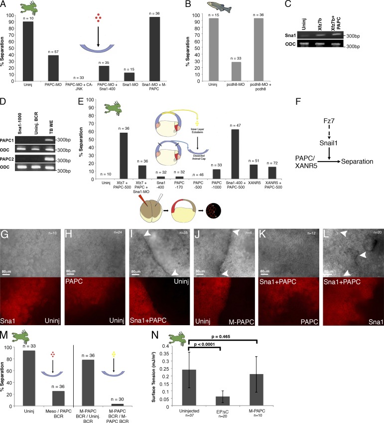 Figure 3. PAPC in tissue separation. (A and B) Quantitation of separation behavior; Xenopus (A) and zebrafish (B) mesoderm test explants on BCR/epiblast. (C and D) RT-PCR of variously injected Xenopus BCR at stage 10 to detect Xsnail1 or PAPC mRNA. TB WE, tailbud stage whole embryo. (E) Ectopic separation behavior in Xenopus BCR. Variously injected BCR test explants were placed on uninjected BCR. (F) Inferred control pathway. (G–L) Ectopic cleft formation in Xenopus BCR. One side of prospective BCR was injected with RDA, cleft was observed in incident light (arrowheads, top), and cell sorting in red fluorescence (bottom). n, number of explants. (M) Quantitation of separation behavior. (left) Xenopus mesoderm on PAPC-injected BCR; (right) M-PAPC BCR on uninjected or M-PAPC BCR. (N) Tissue surface tension of uninjected BCR or BCR expressing DN C-cadherin or M-PAPC. n, number of cell aggregates. Standard deviations are indicated. |