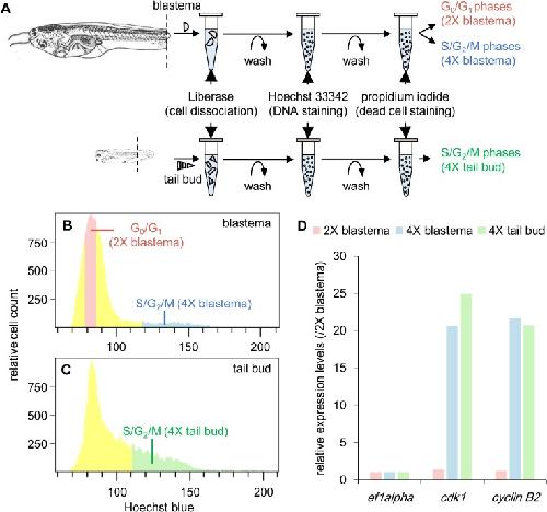 Fig 2. Isolation of proliferating and non-proliferating tail blastema cells and proliferating tail bud cells using flow cytometry.(A) A schematic drawing of the cell preparation procedure. Xenopus images were obtained from [18] and modified. (B,C) Cell cycle analysis of cells in (B) tail blastemas and (C) tail buds using flow cytometry. Horizontal axes represent relative fluorescent intensity of Hoechst blue, which reflects DNA contents, and vertical axes represent relative cell counts. The cells were classified into G0/G1 phases (major peaks), and S/G2/M phases (whose DNA contents were higher than those of cells in the major peak and lower than twice of those of cells in the major peak) based on the DNA content. Cell fractions colored in red (‘2X-tail blastema’ cell fraction), blue (‘4X-tail blastema’ cell fraction), and green (‘4X-tail bud’ cell fraction), respectively, were collected and subjected to RNA-sequence analysis. (D) Comparison of expression levels of cell cycle markers. Relative expression levels were estimated from RNA-sequencing data, taking the values in the ‘2X-tail blastema’ cell fraction as 1. Expression levels of ef1α, a housekeeping gene, were almost the same in all samples.