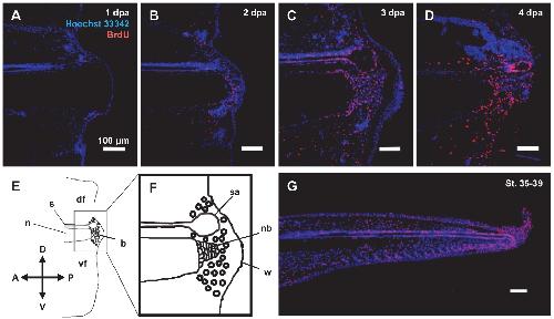 and 4 dpa of St. 49-53 tadpoles or (G) a tail bud of St. 35-39 tadpole were subjected to immunohistochemistry using anti-BrdU antibody (red), and the nuclei