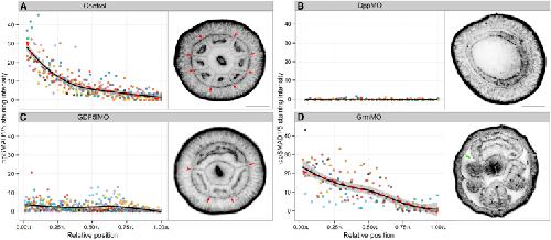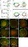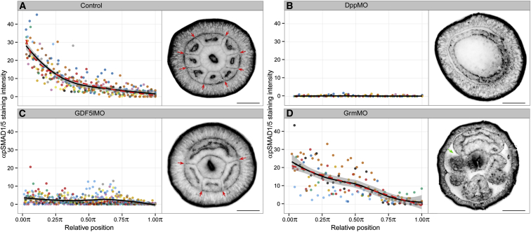 Figure 2. Effect of MO Knockdown on αpSMAD1/5 Staining Gradient and Morphology of Late Planulae(A–D) Nuclear αpSMAD1/5 staining intensity as a function of relative position of each endodermal nucleus along 180° arc from 0 to π starting at the middle of pSMAD1/5-positive domain (see the Supplemental Experimental Procedures and Figure S2A for details on measuring), described by measurements from multiple embryos (colored points) for Control (n = 12), GrmMO (n = 7), GDF5lMO (n = 10), and DppMO (n = 8). LOESS smoothed curves (black lines) with 99% confidence interval for the mean (shade), and linear model fit of the logarithm of relative position to pSMAD1/5 staining intensity (R2 = 0.73, dashed red line) for Control embryos and linear model fit of relative position to pSMAD1/5 staining intensity (R2 = 0.55, dashed red line) for GrmMO embryos. Oral views of corresponding StdMO, DppMO, GDF5lMO, and GrmMO late planulae stained with fluorescent phalloidin are shown next to the graphs (n > 55 for each sample). While StdMO planulae with normal nuclear pSMAD1/5 gradient develop eight mesenteries (red arrows in A), DppMO-injected planulae lacking the pSMAD1/5 gradient do not develop mesenteries at all (B). αpSMAD1/5 staining intensity is suppressed but not absent in the GDF5lMO planulae correlating with the formation of four mesenteries instead of eight (red arrows in C). In GrmMO-treated embryos (D), the average pSMAD1/5 staining intensity is elevated in mid-range positions (see also Figure S2C) and more variable than in Control embryos across the whole range (see also Figure S2D). The endoderm in GrmMO appears compartmentalized but its development is abnormal with extremely thickened mesogloea (green arrow). Scale bars represent 50 μm.See also Figure S2.
