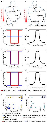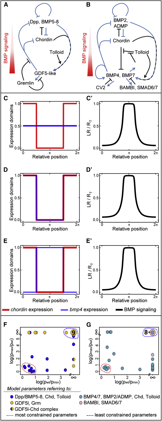Figure 5. Strongly Constrained Core Interactions and Weakly Constrained Modulators of the BMP Signaling System(A and B) Nematostella directive axis network (A) compared to the DV network in Xenopus (B). Blue lines represent transcriptional regulation downstream of BMP signaling and black lines represent protein-protein interactions (putative in case of Nematostella). Xenopus network is modified after (De Robertis and Colozza, 2013; Paulsen et al., 2011). Overlaid blue and black lines represent shuttle function of Chordin.(C–E) Restricted chordin expression domain (red curves on the left plots) results in BMP signaling on the opposite side of the embryo (relative concentration of BMP ligand-receptor complexes shown as black curves on Cʹ–Eʹ) independent of bmp4 expression localization (blue curve). bmp4 can be expressed uniformly (C), on the chordin side (D), or opposite to it (E). The x axis is normalized with respect to maximal domain length (shown as 2π since the embryo is spherical), and the y axis shows the ratio of ligand-bound receptors (LR) with respect to total receptor concentration (RT).(F and G) Constrained core regulators versus weakly constrained modulators of BMP signaling in Nematostella (F) and Xenopus (G).(F) Many parameters describing production, function, and turnover of NvDpp/NvBMP5-8 and NvChd (blue circles) are strongly constrained, while most of the parameters describing production, function, and turnover of NvGDF5-like and NvGrm (orange circles) are weakly constrained. Large orange circle with a 9 corresponds to nine unconstrained parameters related to NvGDF5-like and NvGrm.(G) Many parameters describing production, function, and turnover of frog BMP4/BMP7, ADMP/BMP2, Chordin, and Tolloid (teal circles) are strongly constrained, while most of the parameters describing production, function, and turnover of BAMBI and SMAD6/7 (pink circles) are weakly constrained. Large pink circle with an 8 corresponds to eight unconstrained parameters related to BAMBI and SMAD6/7. Fold of possible increase of parameter values (log scale) is plotted on the y axis, and fold of possible decrease of parameter values (log scale) is plotted on the x axis. (For details see the Supplemental Experimental Procedures and Figure S5.)See also Figure S5.