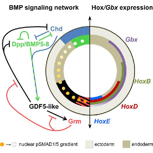 A new molecular logic for BMP-mediated dorsoventral patterning in the leech Helobdella.