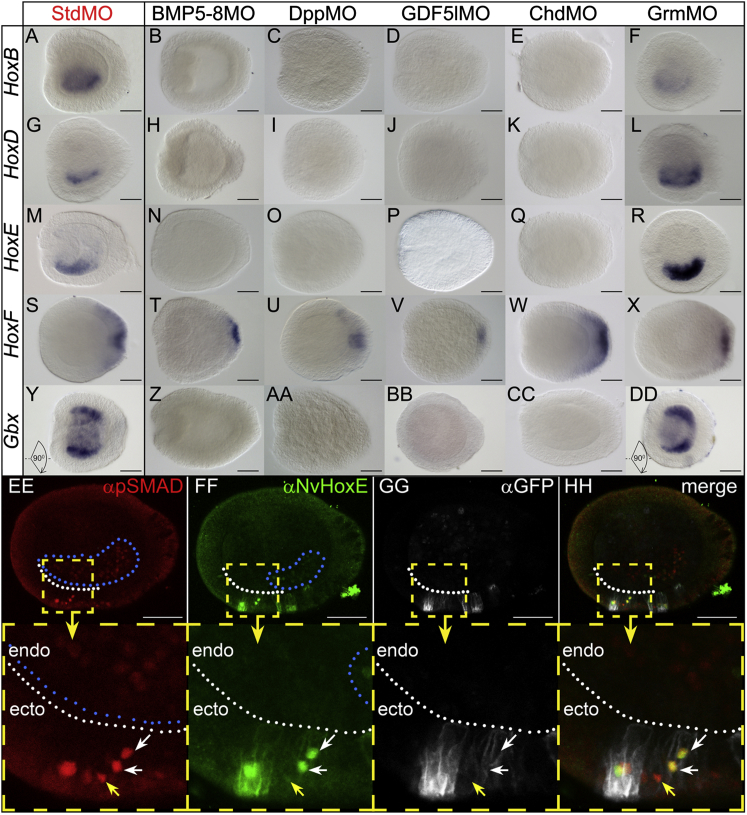 Figure 3. Staggered Endodermal Expression of Hox Genes and NvGbx Is Regulated by BMP Signaling(A–DD) Expression of NvHoxB (A–F), NvHoxD (G–L), NvHoxE (M–R), NvHoxF (S–X), and NvGrm (Y–DD) in StdMO-, BMP5-8MO-, DppMO-, GDF5lMO-, ChdMO-, and GrmMO-injected embryos at early planula stage. Lateral views; oral end to the left. Embryos on (Y) and (DD) are rotated 90° compared to other stained embryos to make bilateral expression of NvGbx visible.(EE–HH) Ectopic expression of BMPRIQ209 > D-EGFP in patches of ectodermal cells in 2-day planula results in ectopic activation of NvHoxE protein. (EE) Ectopic pSMAD1/5-positive nuclei in the ectoderm of early planula in addition to endogenous staining in the endoderm (blue dots). (FF) In addition to endogenous αNvHoxE staining (blue dots), ectopic expression is observed in pSMAD1/5-positive ectodermal nuclei. Apart from specific nuclear NvHoxE signal, the secondary anti-rat antibody cross-reacts with mouse anti-GFP antibody staining the BMPRIQ209 > D-EGFP fusion protein in the cell membranes. (GG) Anti-GFP antibody detects BMPRIQ209 > D-EGFP in cell membranes. Anti-mouse antibody does not cross-react with the rat αNvHoxE, thus no nuclear staining is observed, showing that nuclear staining on (FF) is specific for NvHoxE. (HH) Merged image of (EE–GG). White dots indicate the border between ectoderm and endoderm. White arrows point at two strongly pSMAD1/5-positive ectodermal nuclei in transgenic cells, which also ectopically express NvHoxE. Yellow arrows point at a weakly pSMAD1/5-positive ectodermal nucleus in a transgenic cell, which does not express detectable amounts of NvHoxE. Scale bars represent 50 μm.See also Figure S3.