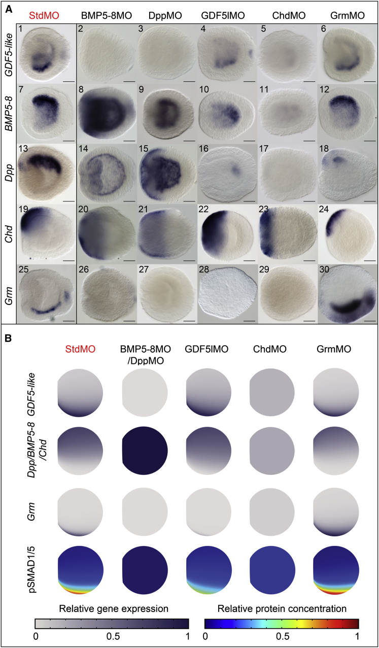 Figure 4. Maintenance of the Directive Axis in Nematostella(A) Expression analysis of network components in morphant early planulae; lateral views, oral end is to the left. Scale bars represent 50 μm.(B) Mathematical model correctly predicts expression patterns of all genes shown in (A) (color code as in ISH), as well as pSMAD1/5 localization (shown as heat maps) in the knockdowns. All expression patterns and pSMAD1/5 staining patterns are plotted onto mesogloea and shown as 2D projections of a 3D structure. Expression domains of NvDpp/NvBMP5-8/NvChd, although not identical, strongly overlap when plotted onto mesogloea. In the model they are controlled by the same mathematical expression and thus plotted together.See also Figures S3 and S4.