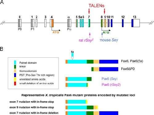 Fig. 1. Strategy for targeted mutagenesis of Xenopus tropicalis pax6 locus. (A) Structure of pax6 gene is shown schematically (not to scale). P0, P1, Pα are promoters (shaded in grey). Exons (boxes) are numbered or named on top (0 to 13 or α) and color coded: white, untranslated regions (UTRs); orange, N-terminal region before the paired domain; other colors correspond to color codes for protein domains shown in (B). Two translation start sites are shown (ATG): orange, for full-length isoforms (Pax6 with or without 5a); green, for paired-less isoform (Pax6δPD). Positions of mouse Sey and rat rSey2 mutations are indicated by arrows on the bottom. Two pairs of TALEN targets in exon 7 and exon 9 are shown on top. (B) Structures of Pax6 wild-type and representative mutant proteins are shown schematically (not to scale). Color codes of protein domains are shown in the box except the first three amino acids, which are shown in orange. Note that the paired domain is located between amino acids 4â131 and the homeodomain between amino acids 212â272 in X. tropicalis due to insertion of two amino acids between the two domains. The amino acid sequence of each domain is as shown in Walther and Gruss (1991). Most but not all mutations have some non-Pax6 amino acids at the C-terminus. Note that X. tropicalis mutations in exon 7 could theoretically encode Pax6δPD if mutations were not simultaneously introduced in exon 9 (not shown in the drawing). (For interpretation of the references to color in this figure legend, the reader is referred to the web version of this article.) |