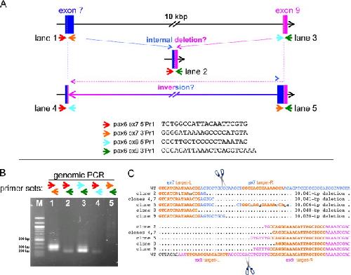 Fig. 3. Strategy for screening mutations in the pax6 locus edited by two pairs of TALENs targeting exon 7 and exon 9 simultaneously. (A) Schematic drawing of targeting regions, only showing exon 7 (blue) and exon 9 (magenta) for simplicity (not to scale). Small colored arrows indicate different primers for genomic PCR of exon 7 and exon 9 (each sequence is shown on the bottom, from 5â² to 3â²). Different combinations of primers can amplify other possible junction regions created by deletion or inversion between exons 7 and 9 as schematically shown. (B) A representative gel pattern of genomic-PCR bands from an embryo injected with both pairs of TALENs mRNAs. In this specific case, one of the possible junctions representing a 3â² inversion site (where a 3â² piece of exon 7 would have been fused inverted to 3â² piece of exon 9, lane 5) was not detected, but in other cases, we have seen such a band. (C) The genomic-PCR band corresponding to what is shown in lane 2 in (B) from 3 pooled embryos was gel-purified, cloned, and sequenced. The results of 6 clones are aligned. Only regions between two target sites (target-Ls, left target; target-Rs, right target in orange) are shown. Corresponding wild-type sequences are shown on top for exon 7 and on the bottom for exon 9. Multiple 10-kb deletion events were confirmed, and junctions where 5â² parts of exon 7 (blue) fused to 3â² parts of exon 9 (magenta) were seen in the expected cleavage regions (in between left and right targets, indicated by scissors) in both exons 7 and 9, suggesting that 10-kbp deletions were due to cleavages by TALENs and thus both TALENs were functional. (For interpretation of the references to color in this figure legend, the reader is referred to the web version of this article.) |