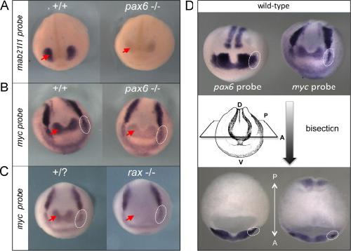 Fig. 6. mab21l1 and myc are downstream of pax6. (A and B) In situ hybridization of wild-type (+/+) and pax6 mutant embryos (â/â, compound heterozygote of complex1 and 10-kbp inversion mutations, see Table S1 for sequence) at st, 21 (A) or st. 15 (B) with mab21l1 (A) or myc (B) probe. Red arrows indicate expression of mab21l1 (A) and myc (B) in the eye region. Expression of both genes is reduced in mutants. (C) In situ hybridization of wild-type (+/?) and rax mutant (â/â, see Fish et al., 2014) embryos with myc probe. Note that myc expression in the presumptive retina region (red arrow) is almost completely lost in the rax mutant as reported previously ( Fish et al., 2014), whereas in the pax6 mutant myc expression is consistently reduced, but to a lesser extent as shown in (B). White dotted circles show the presumptive lens ectoderm (PLE) region, in which expression of myc is indistinguishable between wild-type and rax mutant embryos. By contrast, expression of myc in the PLE of pax6 mutant is reduced compared to the wild-type embryo (B, white dotted circles). (D) In situ hybridization of wild-type embryos with pax6 (top left) and myc (top right) probes at stage 15. The same embryos are bisected at the level shown schematically, clearly showing the expression of pax6 and myc in the PLE (bottom, white dotted circles). (For interpretation of the references to color in this figure legend, the reader is referred to the web version of this article.) |
