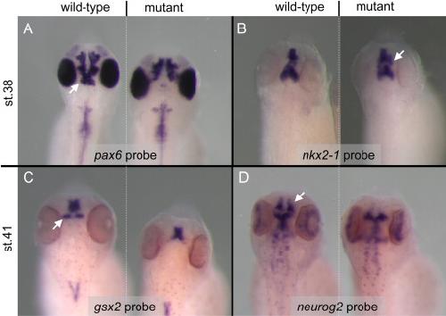 Fig. 7. pax6 mutants display altered forebrain patterning. In situ hybridization comparison of expression patterns of several genes show altered brain patterns in mutant versus wild-type embryos. pax6 mRNA expression is lost from the pretectum (white arrow) and ventral thalamus of mutants, but appears to be maintained normally in more anterior parts of the forebrain including retina at stage 38 (A). By contrast, as seen in panel (B) the expression domain of nkx2-1 appears to be expanded in the telecephalon (white arrow) of pax6 mutants compared to wild-type. gsx2 expression is lost from the prethalamus (C, white arrow) of the mutant, and neurog2 is greatly reduced in the telencephalon (D, white arrow) of mutant embryos. |