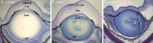 Fig. 11. General histologic features of aniridia-like mutant froglet eyes. Compared with wild-type eyes (A), these mutants show variable defects in cornea, iris, lens and retina. Most notably, the pupil diameter is much wider in the mutants (B and C). Lenses show variable reduction in size and differentiation consistent with the variable presence of cataracts visible upon gross inspection of eyes of intact animals. While the retina is usually present and grossly normal, it may contain folds and the ganglion cell layer (gcl) is somewhat sparse and irregular. The retina may be partially absent as shown in C. Scale bar in panel A=100 µm. |