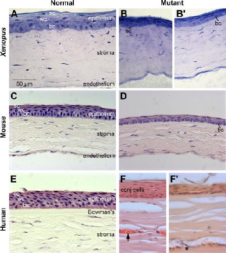 Fig. 13. Xenopus pax6 mutant exhibits corneal defects similar to those observed in Pax6 mutant mice and human aniridia. Histology of the cornea of wild-type (Normal) and Pax6 mutant (Mutant) frog (Xenopus), mice (Mouse), and human (Human). (A) Wild-type froglet. (B) pax6 Hypomorphic froglet. (C) 8-Week-old adult wild-type mouse (D) 8-Week-old adult Pax6Sey-Neu/+ mouse. (E) 70-Year-old human. The cornea did not show clinical signs of keratopathy. (FâFâ²) 49-Year-old individual with classical aniridia. The patient was diagnosed with stage III keratopathy and exhibited full conjunctivalization of the cornea. Arrow denotes blood vessel. Asterisk denotes area of cellular infiltration in the superficial corneal stroma. The samples here were of peripheral cornea. Note: the endothelial layer was not captured in these images of human cornea. bc, basal cells; conj, conjunctival cells, sc, superficial cells; wc, wing cells. Scale bar in panel A applies to panels (BâF). (For interpretation of the references to color in this figure legend, the reader is referred to the web version of this article.) |