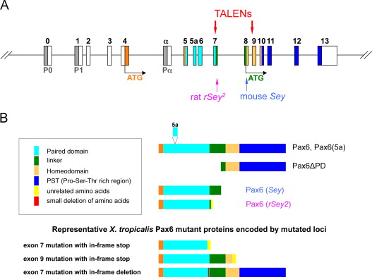 Fig. 1. Strategy for targeted mutagenesis of Xenopus tropicalis pax6 locus. (A) Structure of pax6 gene is shown schematically (not to scale). P0, P1, Pα are promoters (shaded in grey). Exons (boxes) are numbered or named on top (0 to 13 or α) and color coded: white, untranslated regions (UTRs); orange, N-terminal region before the paired domain; other colors correspond to color codes for protein domains shown in (B). Two translation start sites are shown (ATG): orange, for full-length isoforms (Pax6 with or without 5a); green, for paired-less isoform (Pax6δPD). Positions of mouse Sey and rat rSey2 mutations are indicated by arrows on the bottom. Two pairs of TALEN targets in exon 7 and exon 9 are shown on top. (B) Structures of Pax6 wild-type and representative mutant proteins are shown schematically (not to scale). Color codes of protein domains are shown in the box except the first three amino acids, which are shown in orange. Note that the paired domain is located between amino acids 4â131 and the homeodomain between amino acids 212â272 in X. tropicalis due to insertion of two amino acids between the two domains. The amino acid sequence of each domain is as shown in Walther and Gruss (1991). Most but not all mutations have some non-Pax6 amino acids at the C-terminus. Note that X. tropicalis mutations in exon 7 could theoretically encode Pax6δPD if mutations were not simultaneously introduced in exon 9 (not shown in the drawing). (For interpretation of the references to color in this figure legend, the reader is referred to the web version of this article.) |
