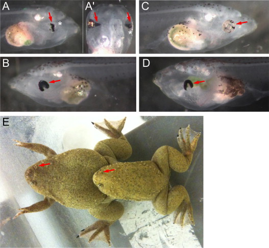 Fig. 2. Representative phenotypes of F0 embryos injected with TALENs. Lateral (A and B) and dorsal (Aâ², the same embryo shown in A) views of two embryos injected with a pair of TALENs targeting pax6 exon 9 (200 pg mRNA each). Asterisks in (A) and (Aâ²) indicate the same abnormal eye. The most frequently seen eye phenotype is shown in (B) (arrow). (C) Lateral view of an embryo injected with a pair of TALENs targeting tyr (200 pg mRNA each). The eye is morphologically normal but less pigmented (arrow). (D) Lateral view of an embryo injected with two pair of TALENs targeting pax6 exons 7 and 9 (200 pg mRNA each). The abnormality here (arrow) is similar to what is shown in (B). (E) Mating of mature frogs raised from embryos injected with two pairs of pax6 TALENs. Eyes are missing in one side of each animal (arrows). |
