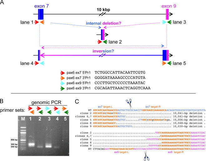 Fig. 3. Strategy for screening mutations in the pax6 locus edited by two pairs of TALENs targeting exon 7 and exon 9 simultaneously. (A) Schematic drawing of targeting regions, only showing exon 7 (blue) and exon 9 (magenta) for simplicity (not to scale). Small colored arrows indicate different primers for genomic PCR of exon 7 and exon 9 (each sequence is shown on the bottom, from 5â² to 3â²). Different combinations of primers can amplify other possible junction regions created by deletion or inversion between exons 7 and 9 as schematically shown. (B) A representative gel pattern of genomic-PCR bands from an embryo injected with both pairs of TALENs mRNAs. In this specific case, one of the possible junctions representing a 3â² inversion site (where a 3â² piece of exon 7 would have been fused inverted to 3â² piece of exon 9, lane 5) was not detected, but in other cases, we have seen such a band. (C) The genomic-PCR band corresponding to what is shown in lane 2 in (B) from 3 pooled embryos was gel-purified, cloned, and sequenced. The results of 6 clones are aligned. Only regions between two target sites (target-Ls, left target; target-Rs, right target in orange) are shown. Corresponding wild-type sequences are shown on top for exon 7 and on the bottom for exon 9. Multiple 10-kb deletion events were confirmed, and junctions where 5â² parts of exon 7 (blue) fused to 3â² parts of exon 9 (magenta) were seen in the expected cleavage regions (in between left and right targets, indicated by scissors) in both exons 7 and 9, suggesting that 10-kbp deletions were due to cleavages by TALENs and thus both TALENs were functional. (For interpretation of the references to color in this figure legend, the reader is referred to the web version of this article.) |